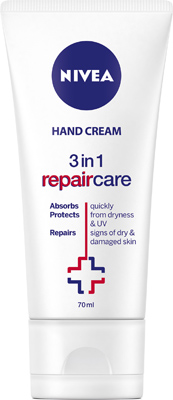 NIVEA 3-in-1 Repair Care Hand Cream is a fast absorbing formula with added vitamin C to protect hands from dryness, repairing signs of damage. The 3-in-1 Repair Care Hand Cream replenishes skin’s moisture levels, protecting against sun damage with SPF15. For maximum results squeeze a pea-sized amount onto clean, dry hands and rub in evenly.